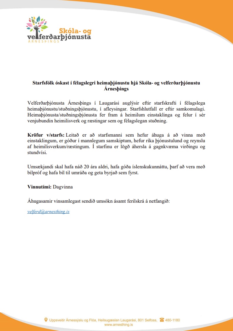 Starfsfólk óskast í félagslegri heimaþjónustu hjá Skóla- og velferðarþjónustu Árnesþings